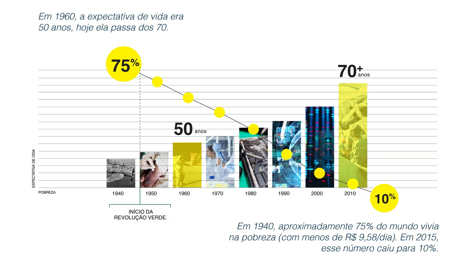 Mas em meados do século XX, o impossível começou a se tornar realidade. A agricultura moderna nasceu, levando milhões de pessoas à classe média global. Até a década de 70, a Revolução Verde nos levou a tecnologias agrícolas que melhoraram drasticamente a produtividade da agricultura. Em diversos lugares do mundo, o padrão se repetia: à medida que a agricultura aumentava, os padrões de vida melhoravam de maneira constante.